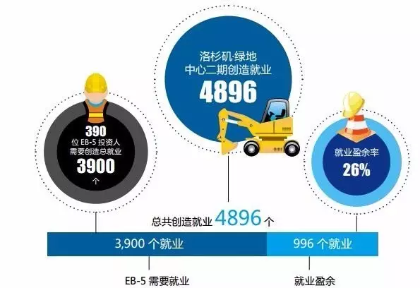 美国著名经济学家依据 RIMS II 经济模型保守计算,绿地中心二期 2A 项目预计创造4,896 个新增就业,390位EB-5投资人需要创造3,900个就业,就业盈余多达998个,就业盈余率26%,完全满足移民局审核及批准无条件绿卡申请的就业指标。