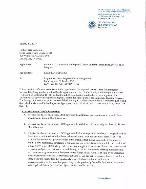 2017年1月27日,项目I-924及I-526范本获移民局(USCIS)批准。