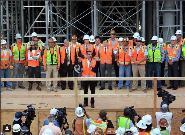 洛杉矶市长Eric Garcetti及洛杉矶/橙县建筑工人工会主席Ron Miller一行莅临绿地中心二期项目工地慰问工人 拍摄于2016年8月