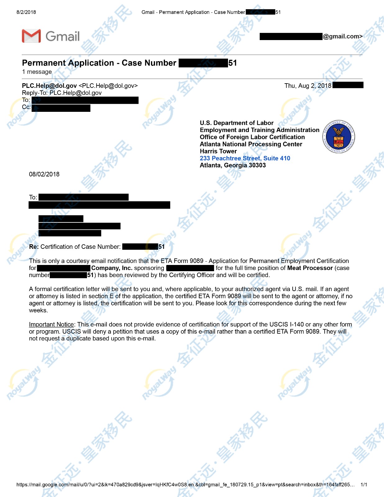 金征远皇家移民成功客户美国劳工卡部分展示