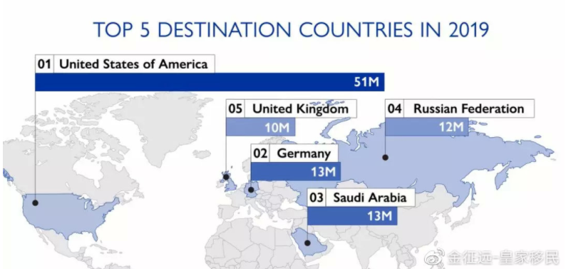 美国仍然是最大的目的地国,截止到2019年共接收了5100万移民,其次为德国、沙特阿拉伯、俄罗斯和英国。统计显示,一半以上的跨国移民居住在欧洲和北美,约为1.41亿人。