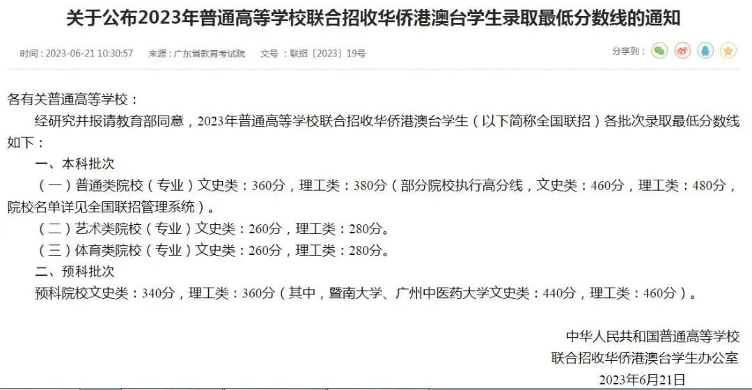 还有一个考试的分数线已经公布,那就是:2023年普通高等学校联合招收华侨港澳台学生的录取分数线。